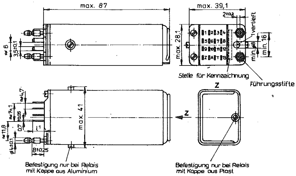 Die folgenden Abbildungen (Quelle TGL 6625) zeigen die Hauptmaße und die Anschlussbezeichnungen der Relais.